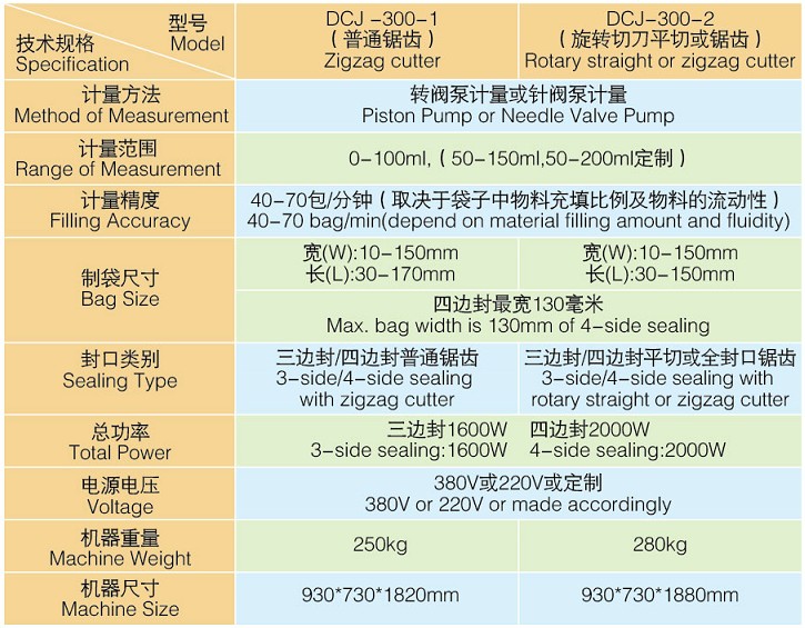 DCJ-300三边封/四边封液体自动包装机技术规格: